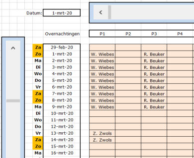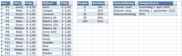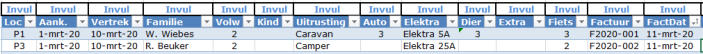 Planning voor een campingVoor een planning zijn er vele toepassingen. Als voorbeeld hier een planning van een camping.In deze planning wordt gebruik gemaakt van één bestand met:•Adresgegevens van de bezoekende kampeerder•Invoer van verblijfsgegevens•Planningsoverzicht•Tabellen•FacturatieDoor in het planningsoverzicht te schuiven metde loper in de lichtblauwe balken bovenin en linkskan heel snel zichtbaar gemaakt worden welkekampeerplekken op welk moment bezet of beschik-baar zijn.Achterliggend is er sprake van een tabblad met tabellen. Hierin kan allerlei van toepassing zijnde informatie worden ingevoerd.Zodra in het tabblad Invoer een factuurnummer en een factuurdatum isingegeven kan er automatische een factuur opgemaakt worden.Deze planning geeft een voorbeeld van mogelijkheden. Desgewenst kunnen er nog allerlei aanpassingen gemaakt en aanvullingen worden. Laat me weten wat uw specifieke wensen zijn.